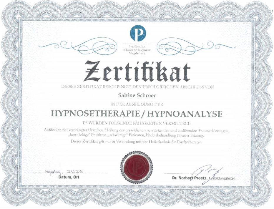 Meiner jahrelangen Erfahrung nach sind die meisten persönlichen Probleme in zwei Hypnose-Sitzungen lösbar. Dabei werden innere Blockaden im Unterbewusstsein gelöst, sodass freies Handeln wieder möglich wird.